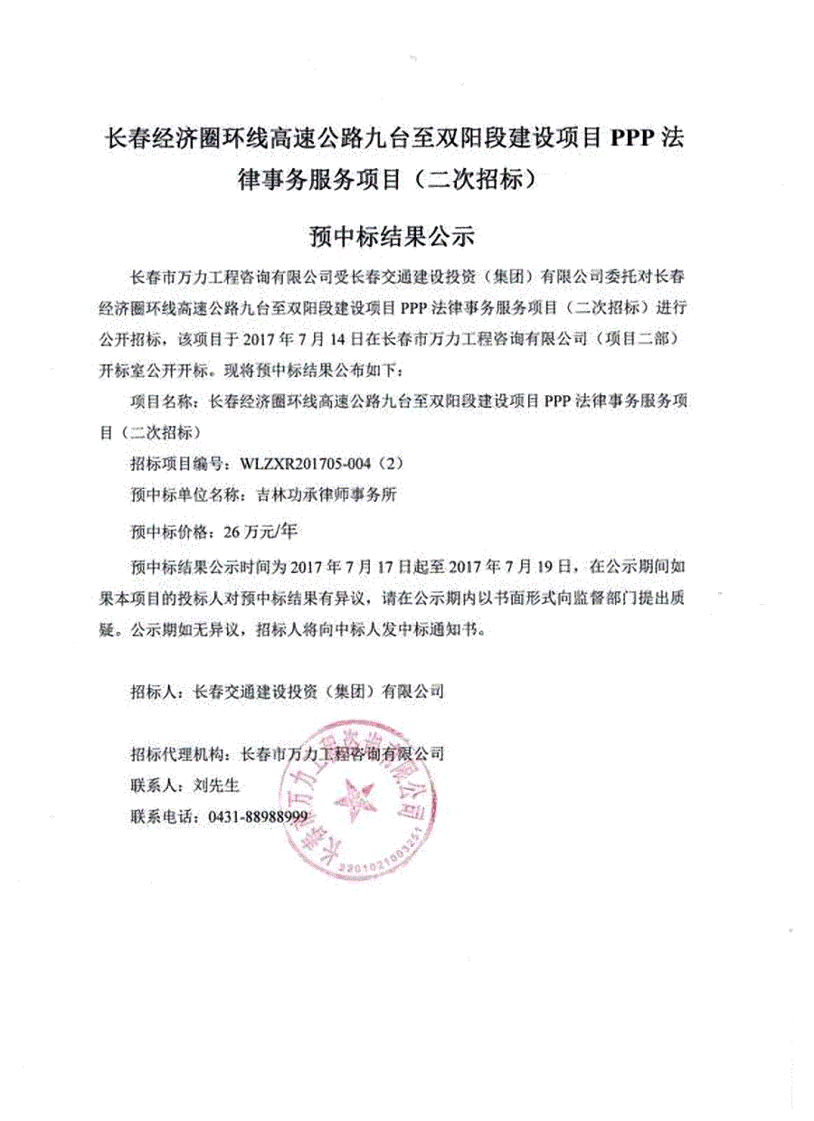 长春经济圈环线高速公路九台至双阳段建设项目PPP法律事务服务项目(二次招标)预中标结果公示